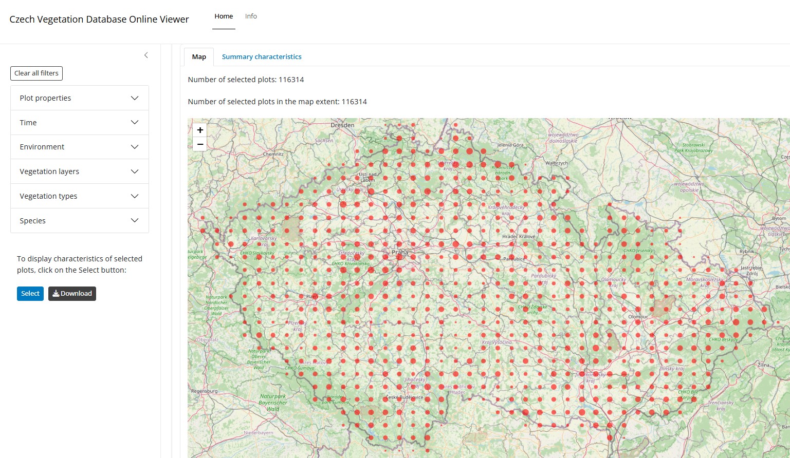 This interactive data viewer provides maps and summary characteristics of vegetation plots for the entire Czech Vegetation Database and its subsets defined by plot size and location uncertainty, years of sampling, altitude, covers of vegetation layers, and occurrence of specific species or species groups.