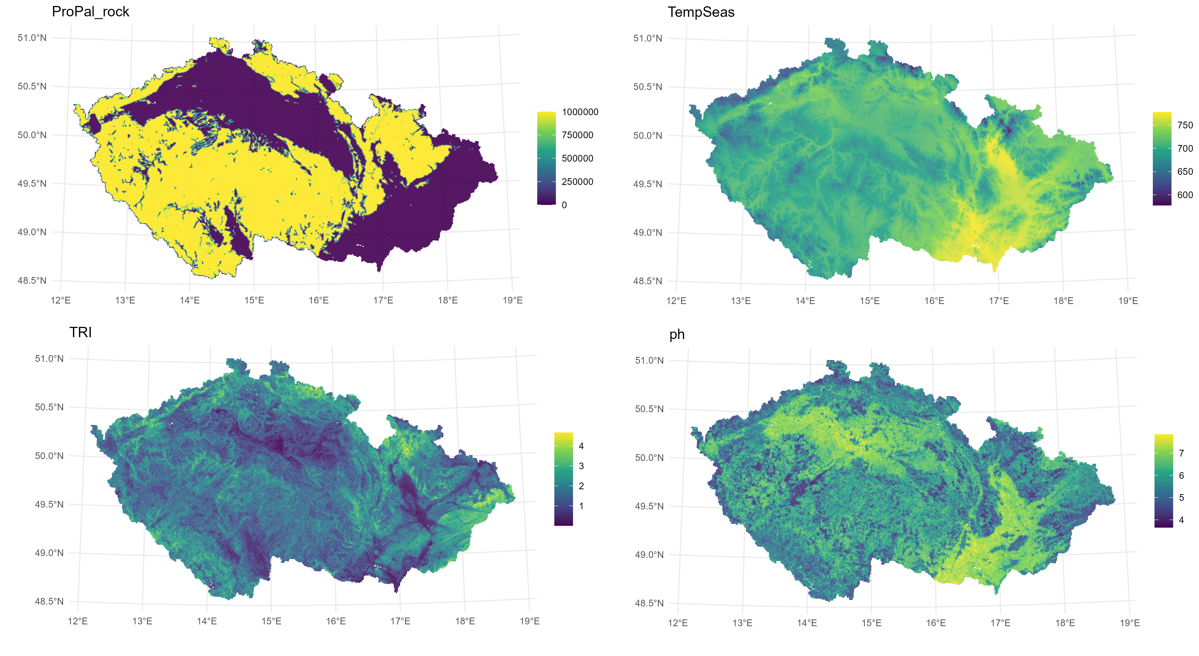 env.cz <- left_join(geology.grid.area.wide, raster_values, by = "CELLCODE")Visual inspection of maps of the calculated variables: